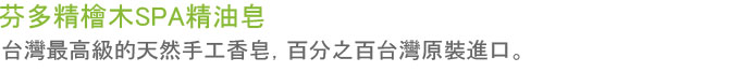【芬多精檜木SPA精油皂】是以檜木為原料,天然珍貴,無任何化學添加物,因此不會刺激皮膚,適合任何性質的肌膚。含有濃、純、香的芬多精香氣,能給予肌膚親密的呵護;芬多精的香氣更能使身心舒暢,提升精、氣、神,將你疲憊的身心靈徹底洗淨,洗後全身舒暢。